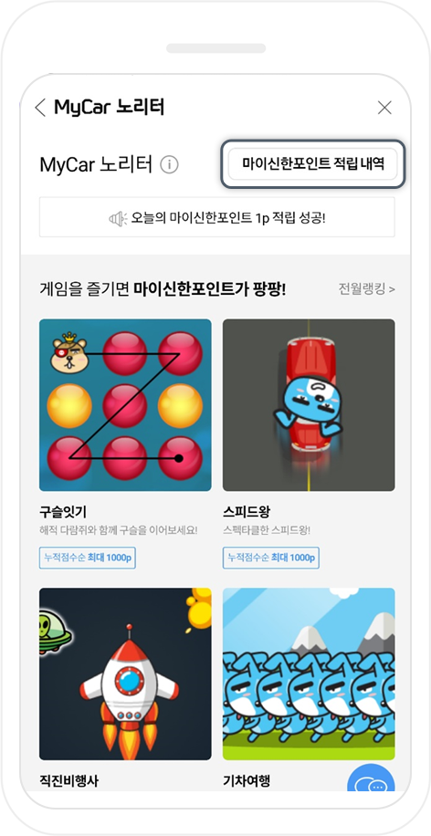 마이카 앱 전용 게임이며, 매월 4가지 미니게임으로 마이카와 놀다보면 포인트(출첵, 랭킹)가 적립되는 서비스입니다.